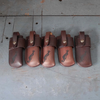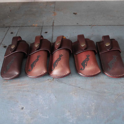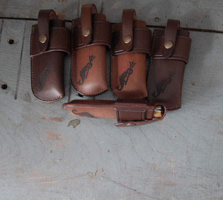 Voici un lot d'étuis de couteau réalisé en cuir tannage végétal de la tannerie De Chamont en épaisseur 1,5 / 2 mm. A noter que l'on a joué sur le nourrissage pour obtenir des nuances.